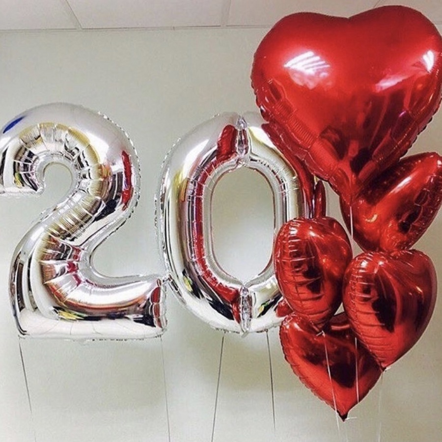 Number 20 and 5 RED Hearts Balloons